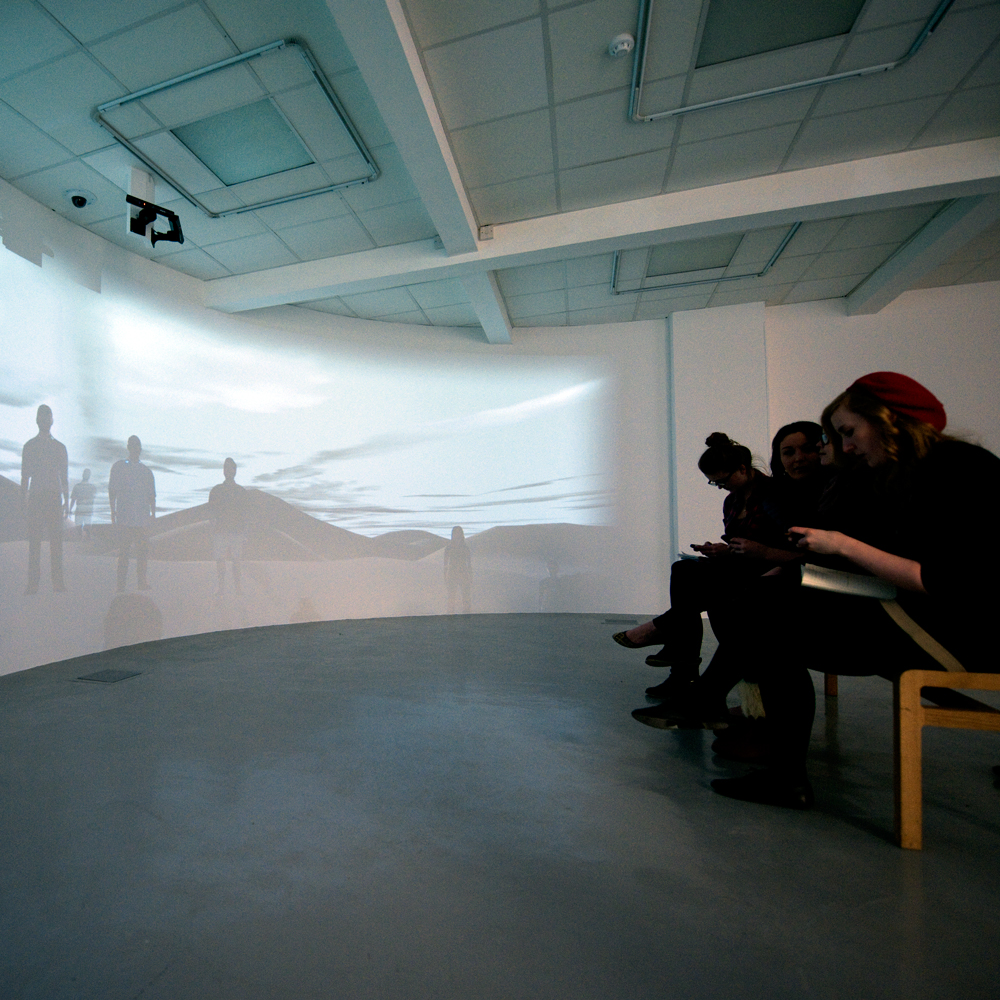 Upon entering the gallery, visitors are immersed in a landscape that crosses the physical and the virtual. The disquieting Observer Effect presents viewers with a projected image of a distant, self-absorbed population. As audiences remain within the space, this virtual community grows in number and becomes distracted by their presence.